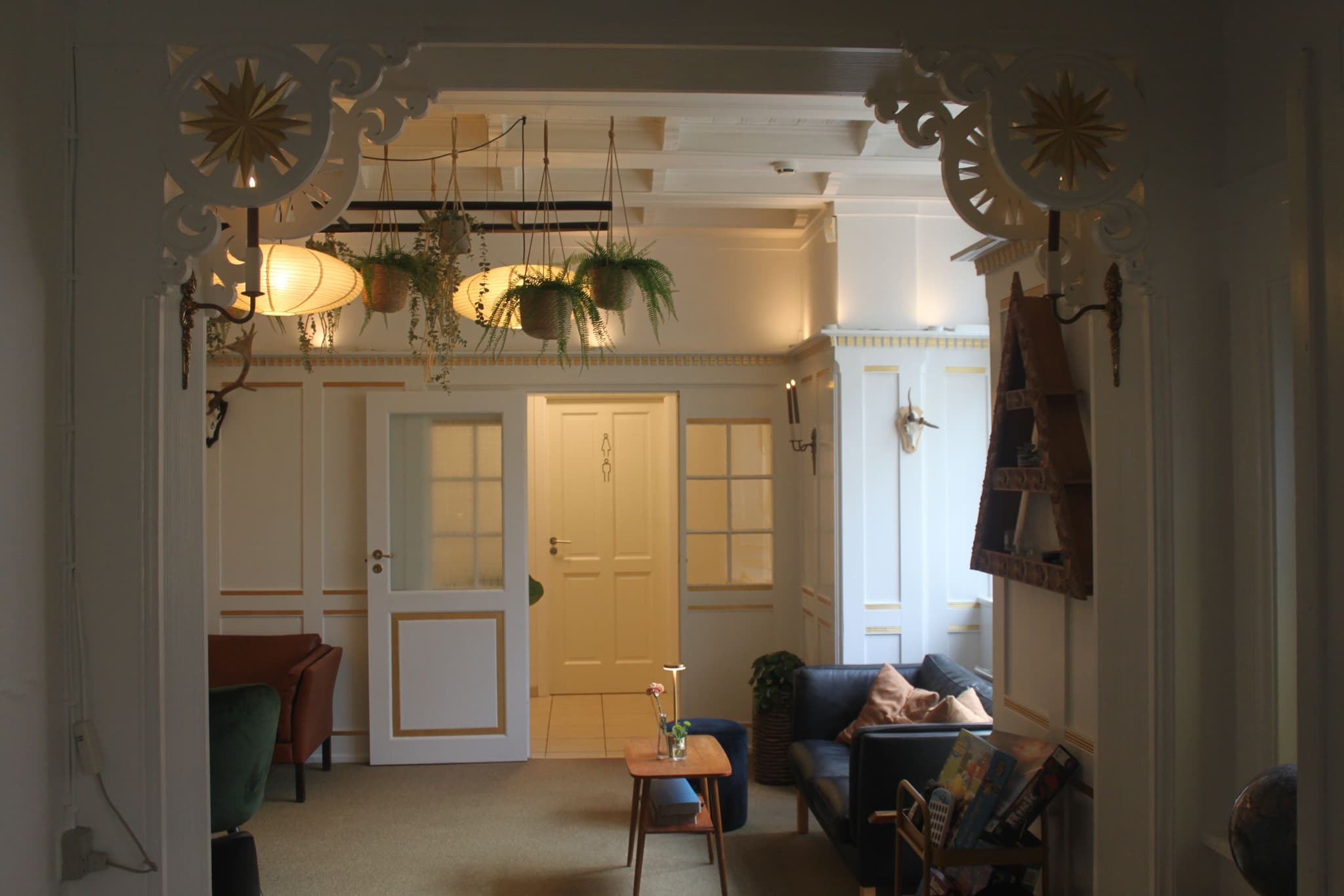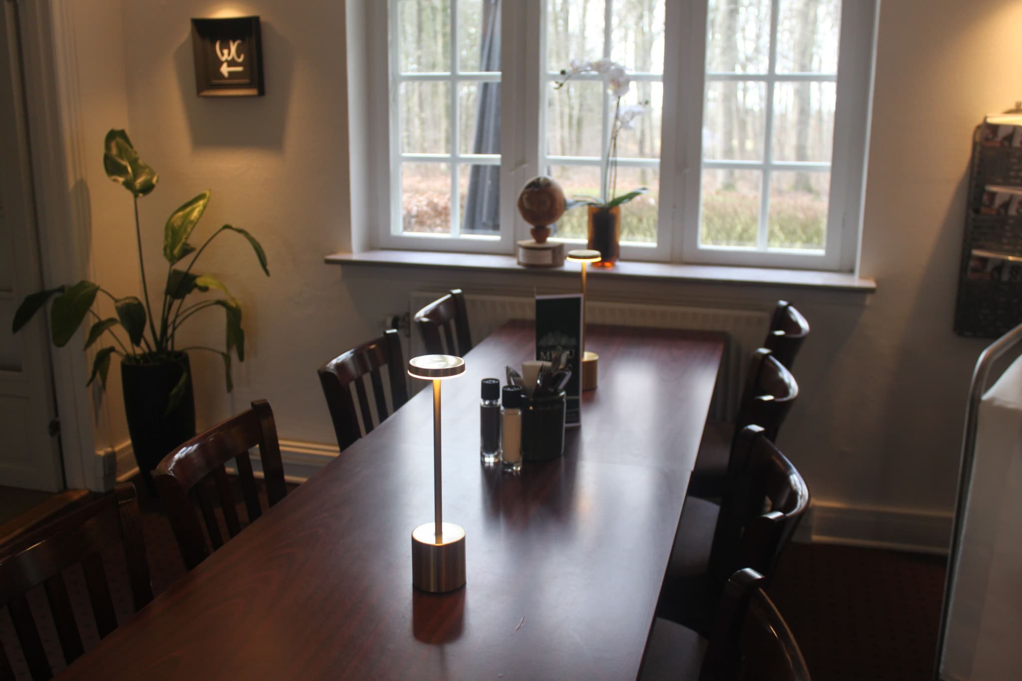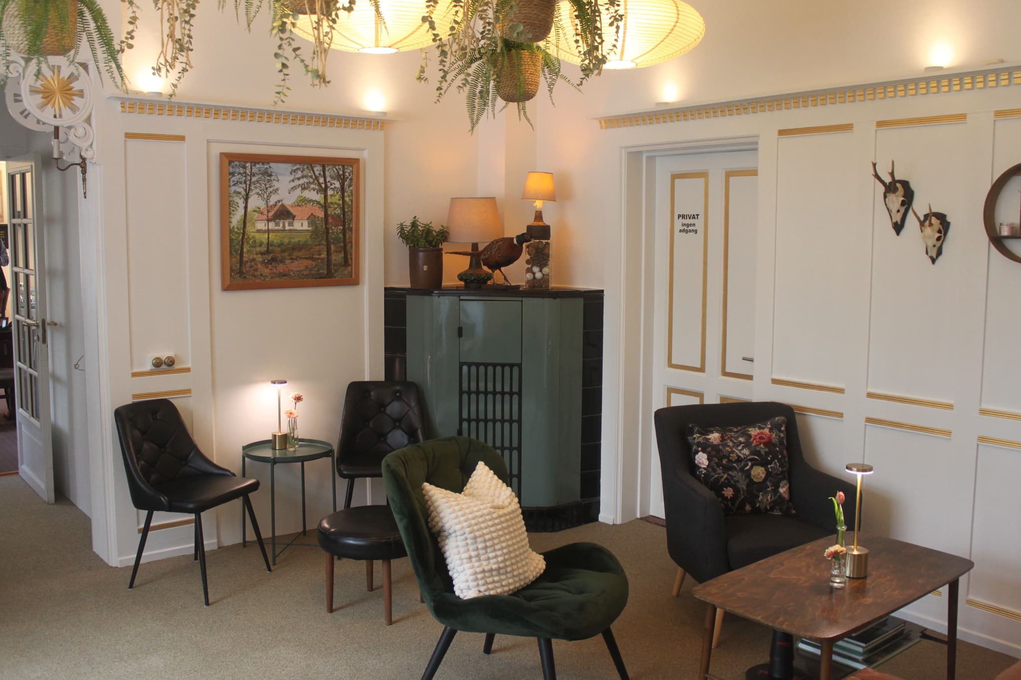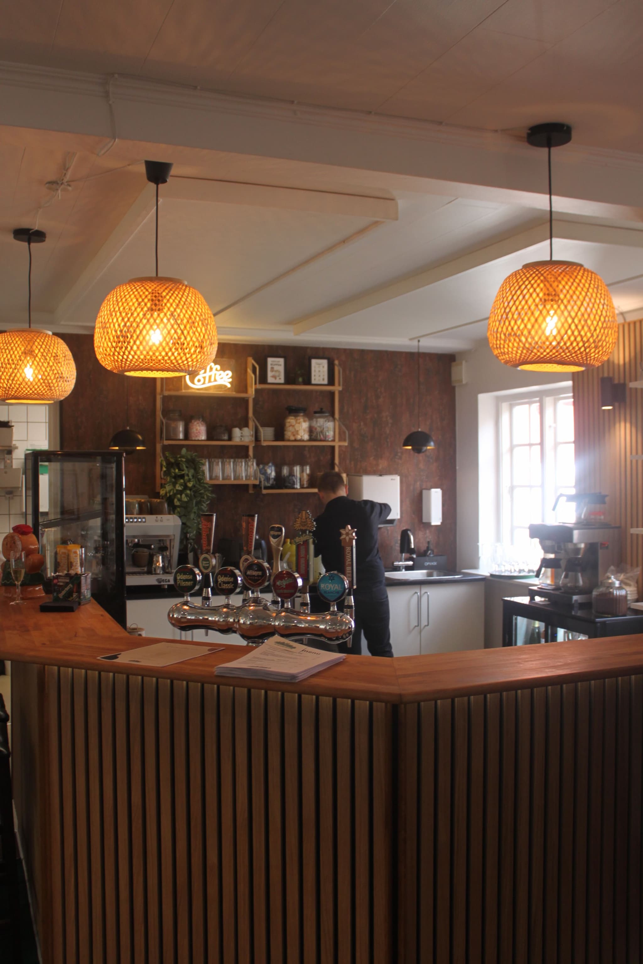 Caféen er lille og hyggelig, og vi har også festlokaler på 1. sal til forskellige arrangementer.